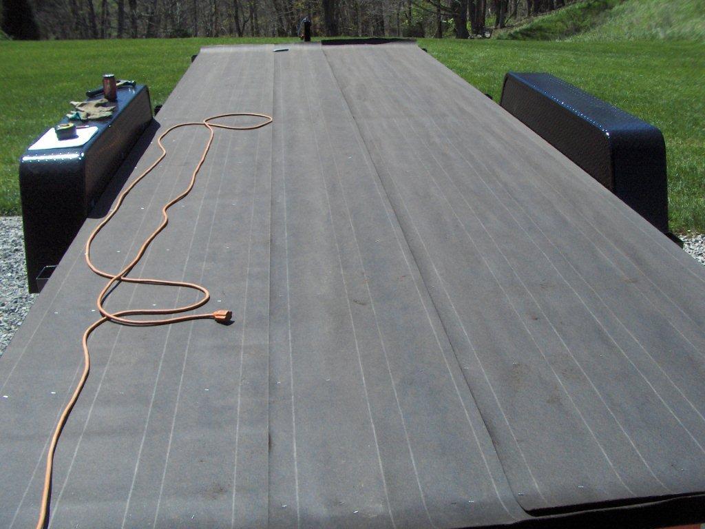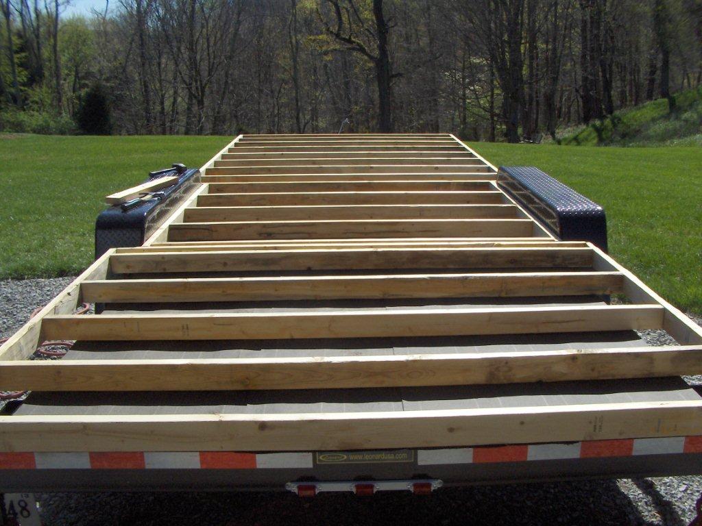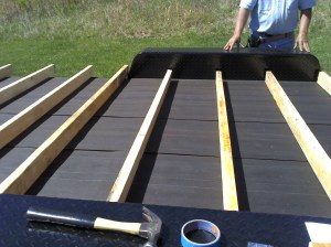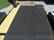 Most people say to remove every other board from the trailer deck, but we opted to leave them all on. The trailer’s GVWR is 10,000 pounds so weight shouldn’t be an issue. Plus, the whole structure should be more insulated and stable this way. It also saved me about an hour of work! So down went the roofing paper to keep critters out and provide a bit of insulation. I rolled one length out, cut to size, and stapled. Thank goodness dad had a staple gun instead of using a low-tech one. I know, I know – it used some electricity. If you take issue with that, I would be happy to have you come down to hand-staple next time 😉
