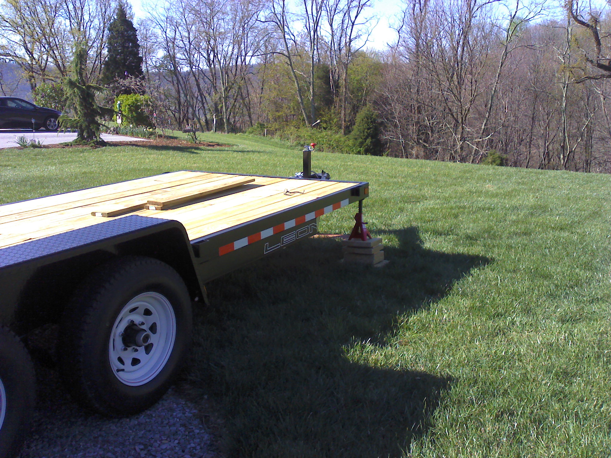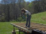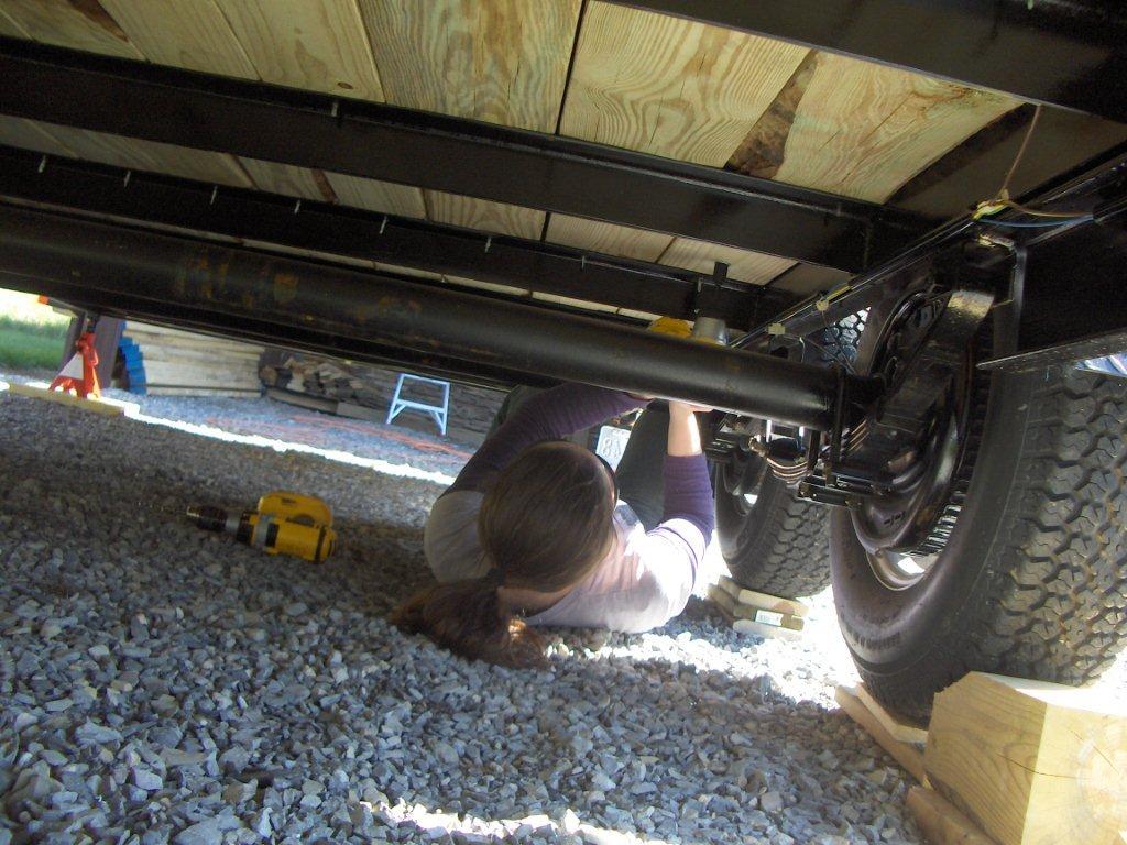 Once the frame is done, it has to be attached to the trailer itself. You have to use lag bolts and screw them in from underneath…think about it – how do you figure out where your 2x4s are in order to screw them into place? Well that’s one of the many reasons I have a construction genius sponsoring this operation. My dad suggested pre-drilling small holes from the top down through the decking. Then, you can see where the holes need to be from underneath! Love it.