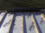 To be honest, the pre-drilling happened on day 1. The lag bolts didn’t go in until day 2 but it seemed odd to stop the post in the middle of a topic. Before we bolted the frame down on day 2, day 1 ended with installing foam board insulation. We tried steak knives and electrical saws…knives wore our hands out, but the saw created such a mess that it would have clogged it.