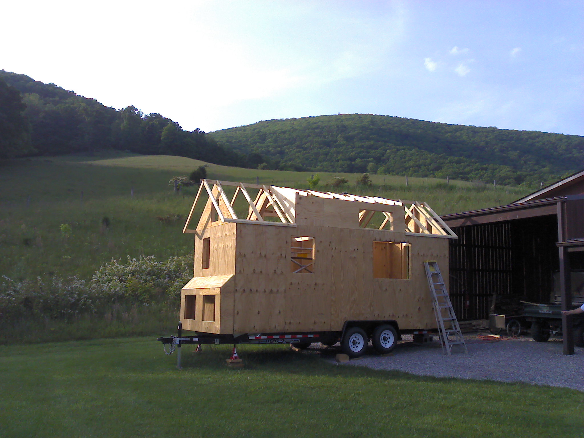 2.5 hours worked today, so this will be pretty short. We found a small mistake made yesterday around the triangles so we cut out the trusses, trimmed them, and put them back in place. It looked fine yesterday because sometimes it’s difficult to visualize how the next piece of the puzzle fits with the current one. Luckily it was a quick fix! Next we put plywood up on the dormers and cut out space for the windows. You can really see now where I opted to not put in one of the windows…looks a little like a cyclops but I am still confident in my decision.
