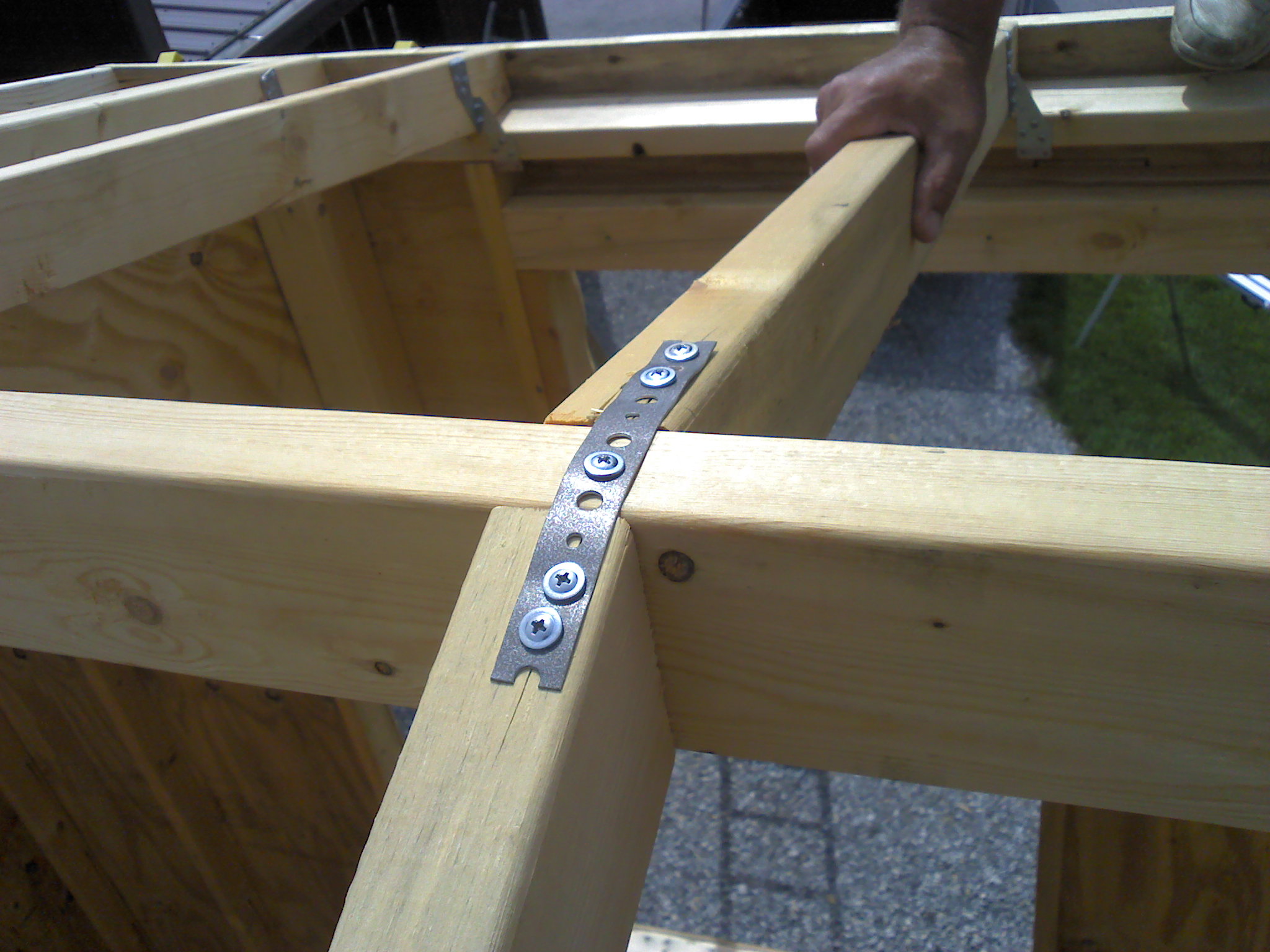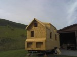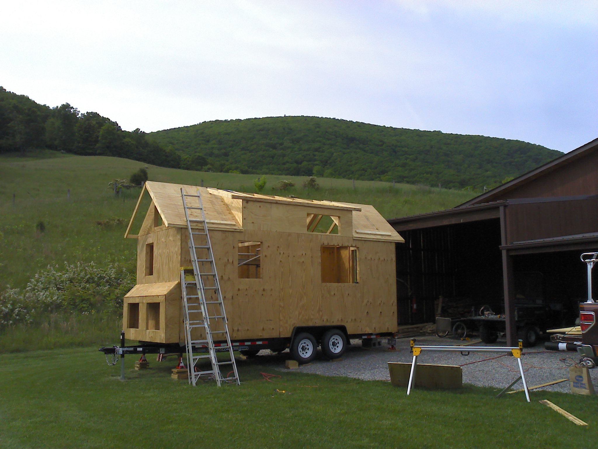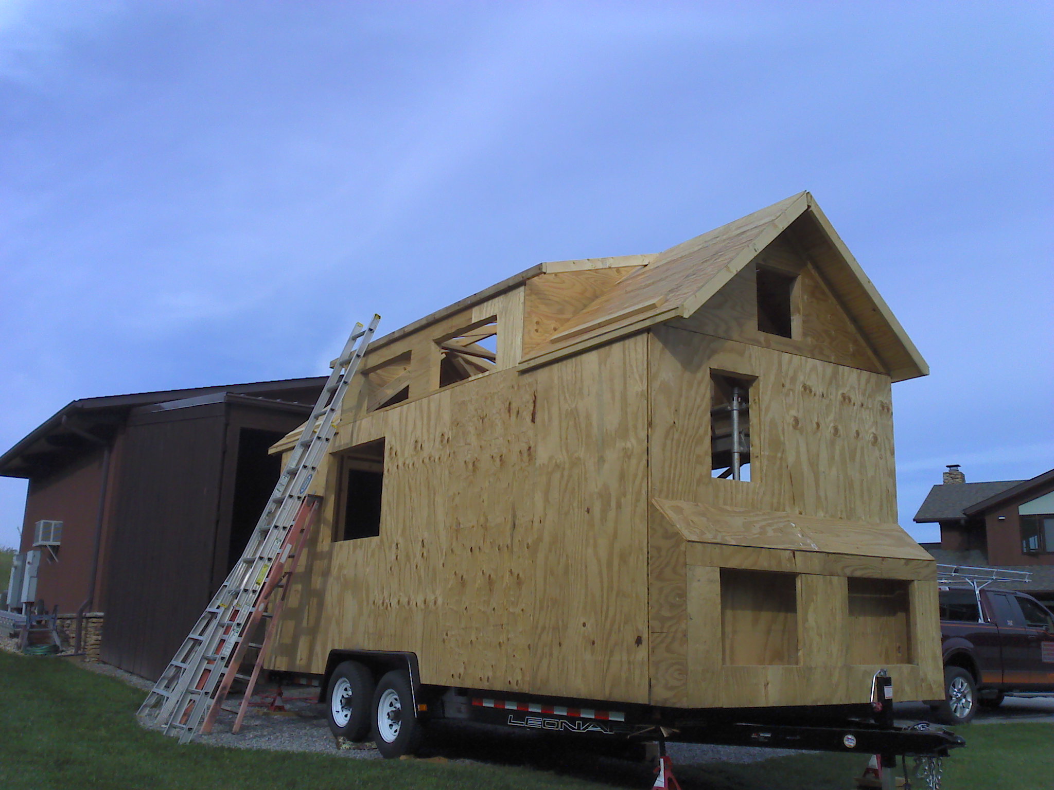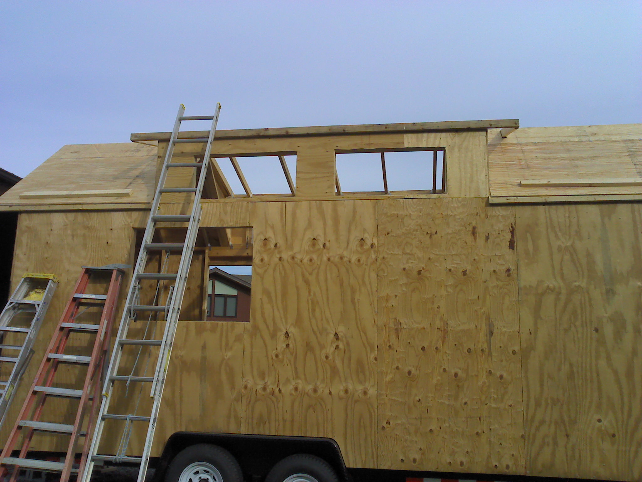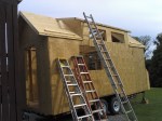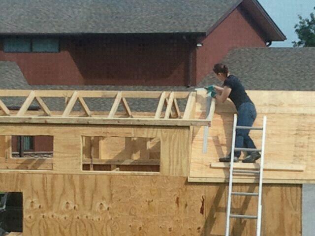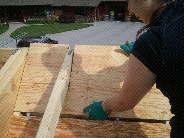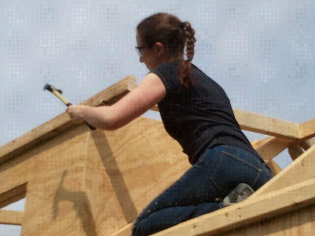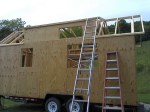 Another roof day! This one was more exciting than the others though because plywood eventually went up. First I put on a few more brackets that secure all the planes of the house together, and then some went on over the roof trusses. Those were a bit of a pain, to be honest. The height, angle, and my shortness made for a frustrating combination. I keep thinking about them like the hurricane ties that they use in Florida…they seem like the tiny house equivalent to me.