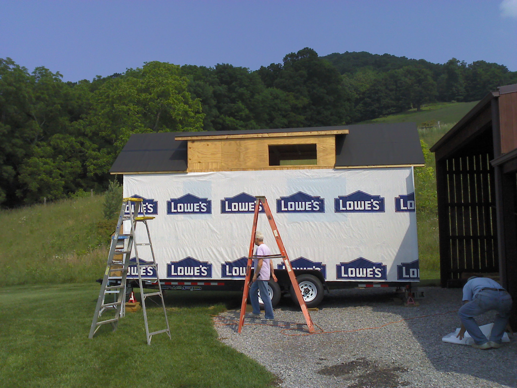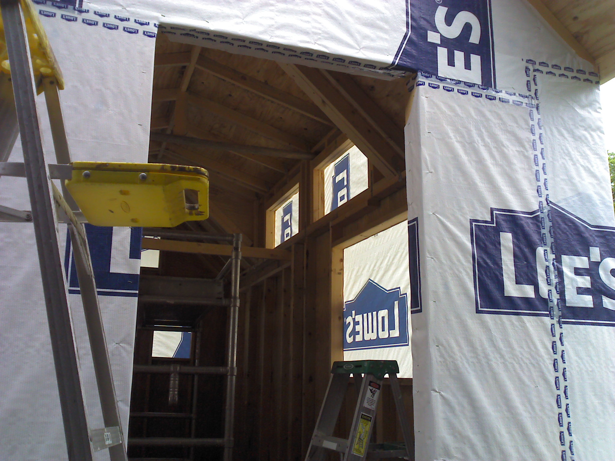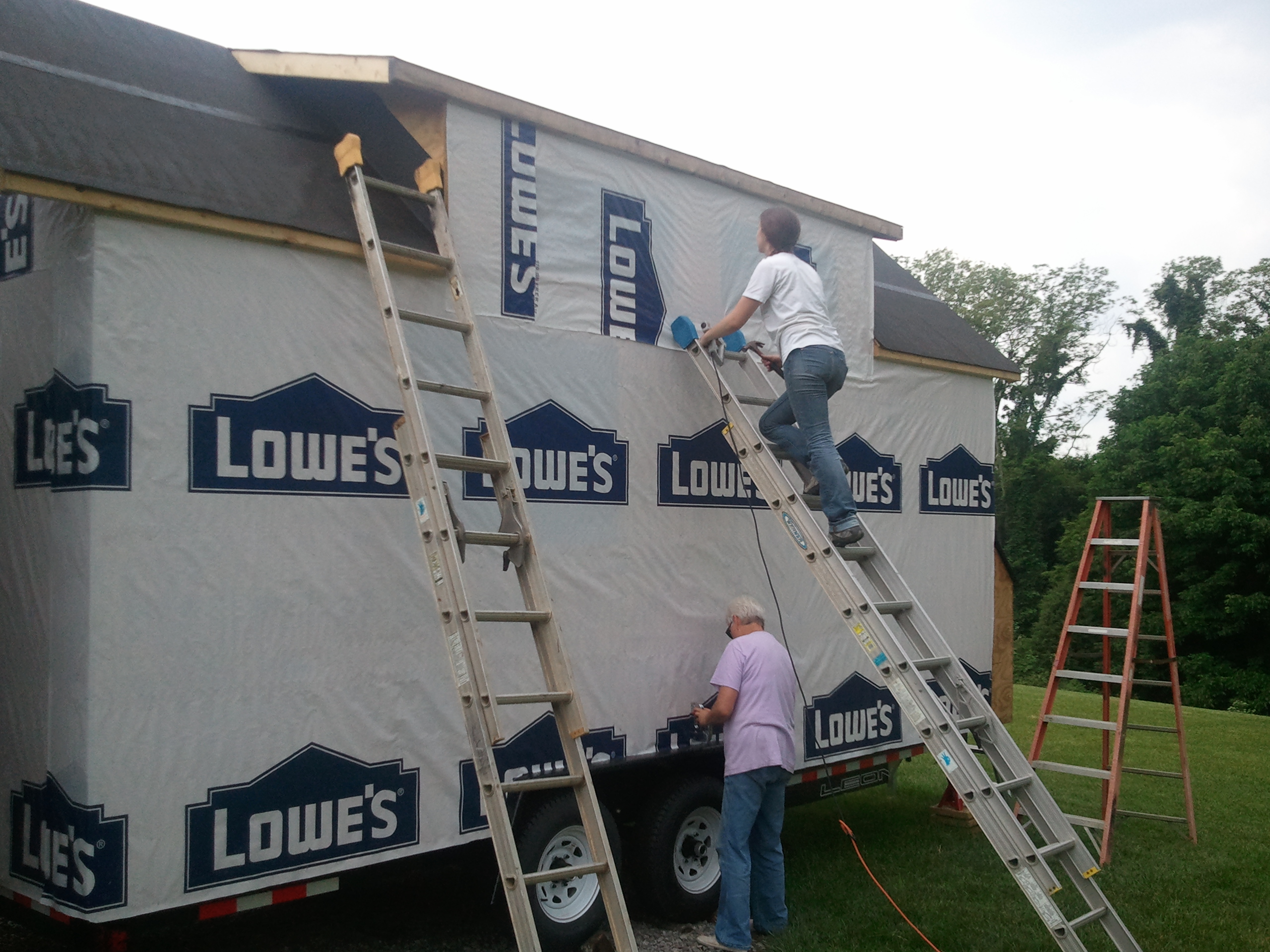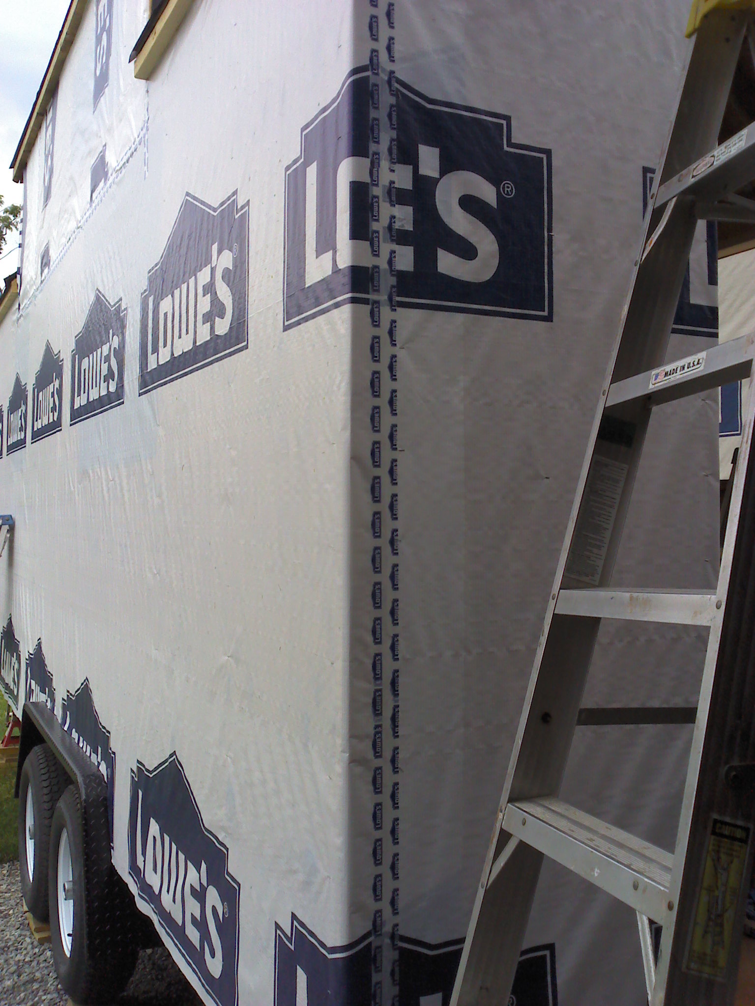 Back to my original point – Lowe’s wrap it is for convenience, logistics, price, and quality. I’m going to see about having an open house at the Lowe’s nearby once this is done, so the pictures look like good advertising for them anyway. Luckily we didn’t need more than one roll of wrap! I was also able to save some tape by using some of dad’s from a previous project. I am always happy to use leftovers if they’re still good – saves on material demand and cost. This ended up being a 3 person job in order to make quick work of it, so we borrowed mother dearest again 🙂