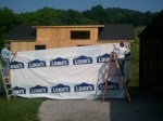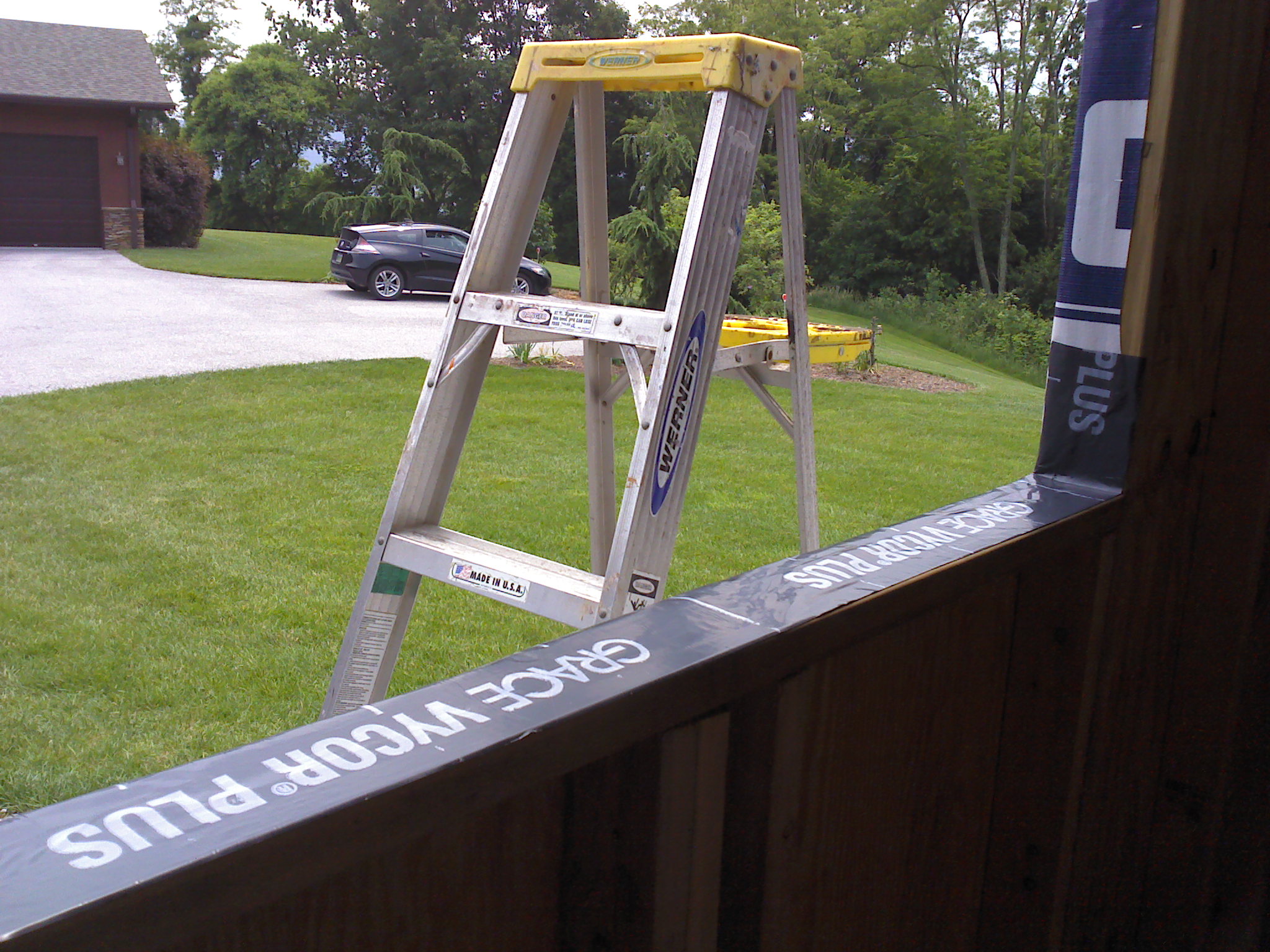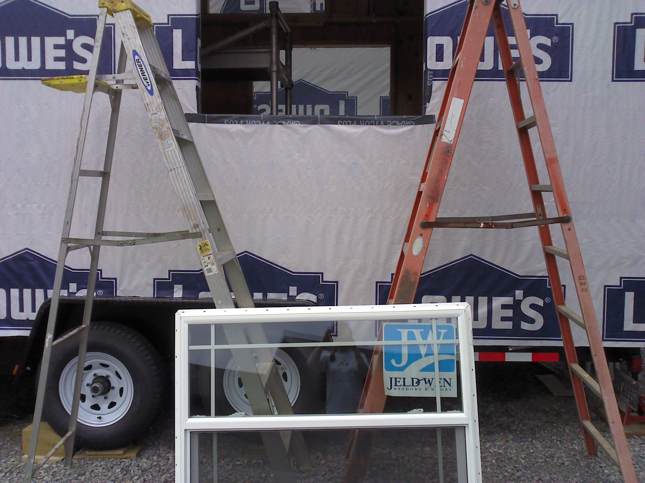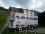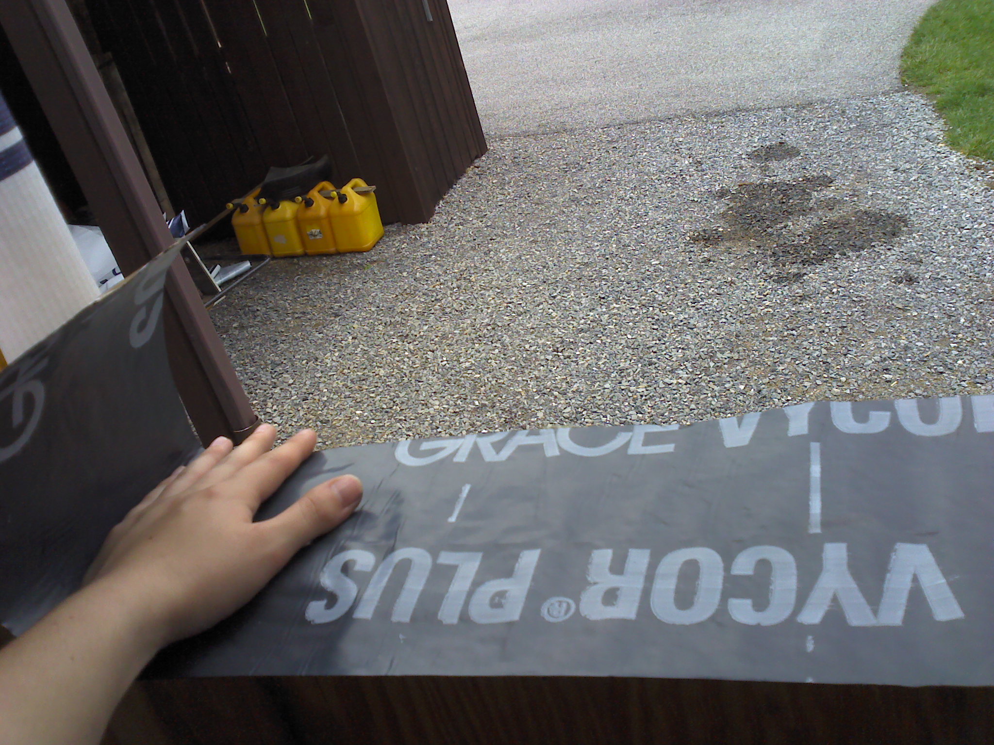Back to my original point – Lowe’s wrap it is for convenience, logistics, price, and quality. I’m going to see about having an open house at the Lowe’s nearby once this is done, so the pictures look like good advertising for them anyway. Luckily we didn’t need more than one roll of wrap! I was also able to save some tape by using some of dad’s from a previous project. I am always happy to use leftovers if they’re still good – saves on material demand and cost. This ended up being a 3 person job in order to make quick work of it, so we borrowed mother dearest again 🙂