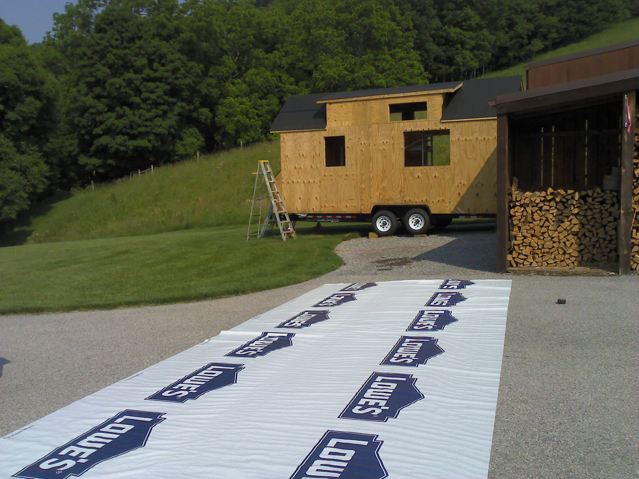 Today was house wrap day! This was a neat transformation for me, as I’ve been staring at plywood walls for a while now. I went with Lowe’s house wrap because I couldn’t get any from smaller, local stores. I did research eco-friendly house wrap but couldn’t find anything legit that was made from recycled materials…they all say “recyclable.” Fair enough. My watch happens to be made from old Tyvek.