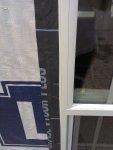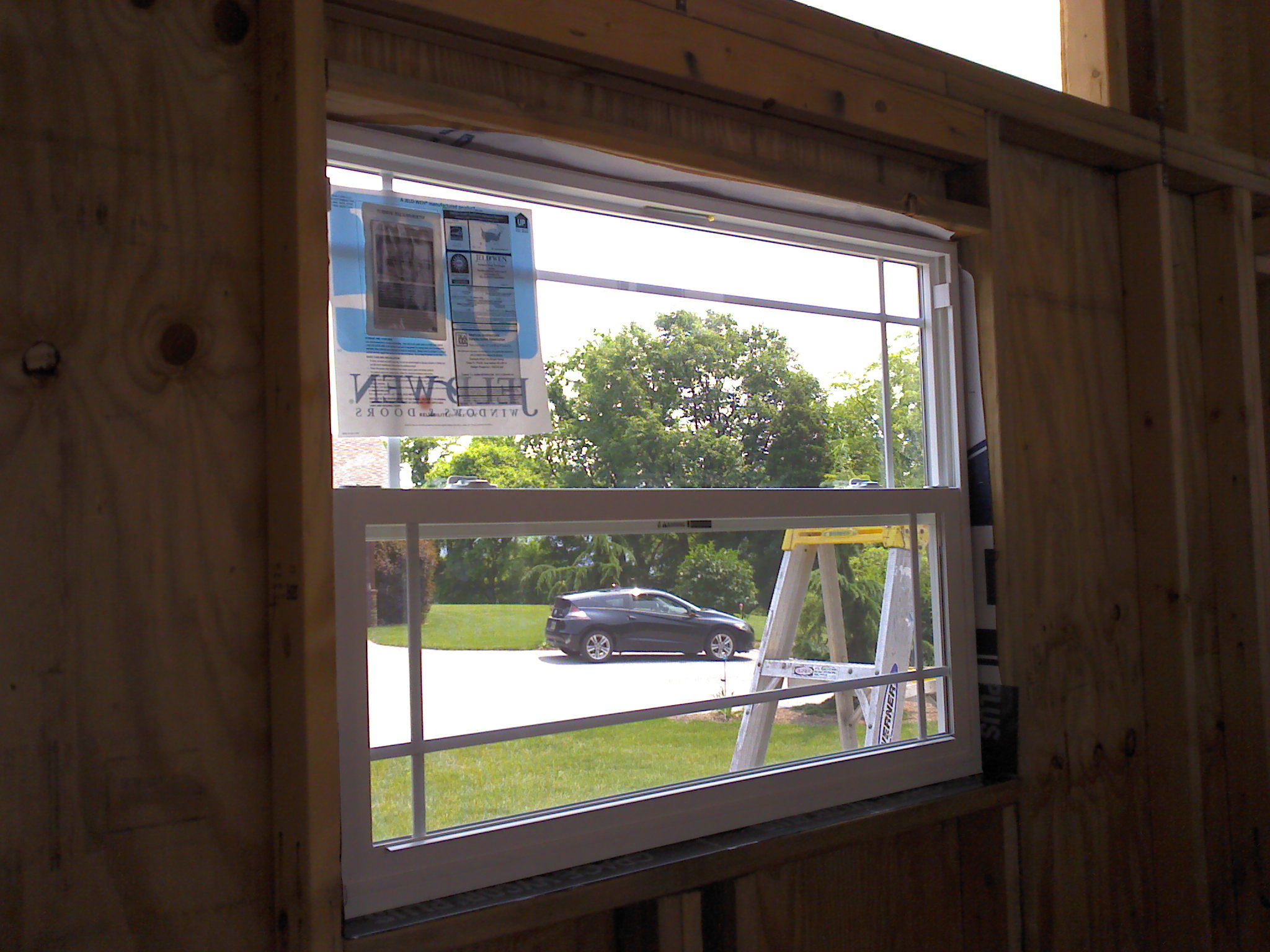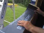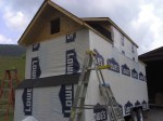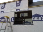 After the house wrap was stapled in place everywhere it needed to be, I taped over the seams to seal out moisture and moved on to the window openings. I only did one today because there was a chance of rain. After cutting and peeling back the wrap on one of the living room window holes, we laid down some of the most sticky flashing I have ever seen! I always thought flashing was metal, but apparently not. And this stuff is really high quality…no worries about leaks here (did you see the stuff we used on the roof??). In went the window, we nailed around it, and taped it all up around the edges. I am really happy to see the big windows in the living room rather than two small ones on each side (no offense to everyone else’s window layout). I think it takes better advantage of good views and it saved a little bit of money and material.